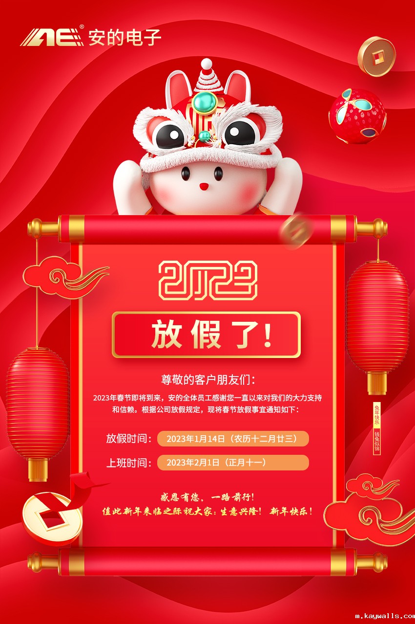 2023年春节即将到来,安的全体员工感谢您一直以来对我们的大力支持和信赖,根据公司放假规定,现将春节放假事宜通知如下: