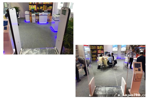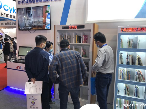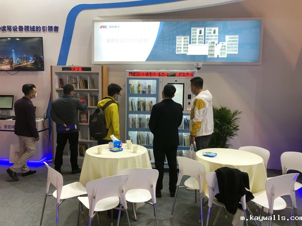 在展会现场,安的展示了全新款的自助借还书机、智能书架以及微型图书馆。