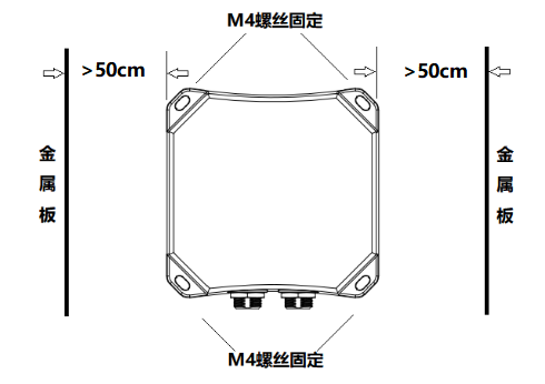 本设备可采用4个M4螺丝固定到使用的位置,可以根据客户现场的安装的环境,为客户定制安装支架。如果读写器的任何一侧有金属板,则读写器需要距离 金属板至少50cm,否则会影响读写器射频信号,造成读写器识读距离达不到预期距离,甚至完全无法识读。