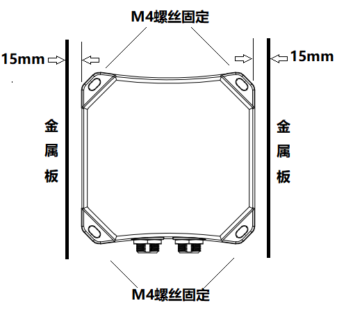 本设备可采用4个M4螺丝固定到使用的位置,可以根据客户现场的安装的环境,为客户定制安装支架。如果读写器的任何一侧有金属板,则读写器需 要离开金属板至少15mm,否则会影响读写器射频信号,造成读写器识读距离达不到预期距离,甚至完全无法识读。